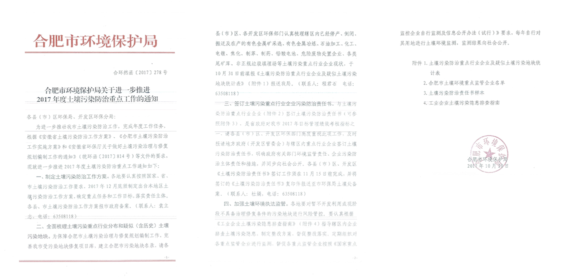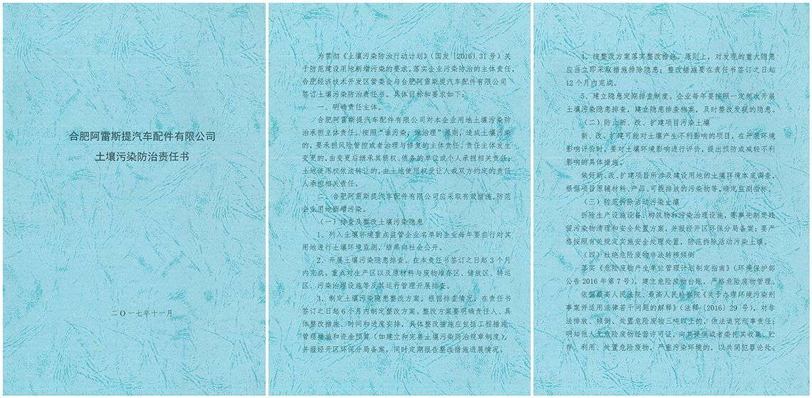 根據(jù)《合肥市環(huán)境保護局關(guān)于進一步推進2017年度土壤污染防治重點工作的通知》(合環(huán)然函[2017]278號)(附件1)要求,合肥阿雷斯提汽車配件有限公司與合肥經(jīng)濟技術(shù)開發(fā)區(qū)管委會簽訂了《合肥阿雷斯提汽車配件有限公司土壤污染防治責(zé)任書》(附件2),責(zé)任書要求企業(yè)每年要自行對企業(yè)用地進行土壤環(huán)境監(jiān)測,開展土壤污染排查。根據(jù)排查情況,制定土壤污染隱患整改方案。