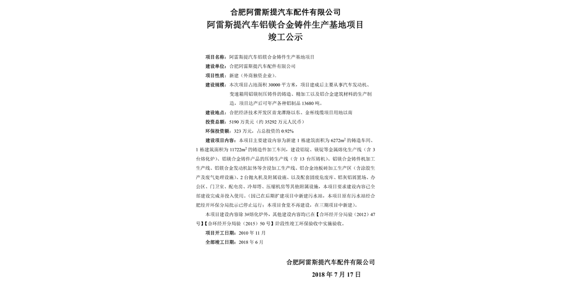 阿雷斯提汽車鋁鎂合金鑄件生產(chǎn)基地項(xiàng)目竣工公示