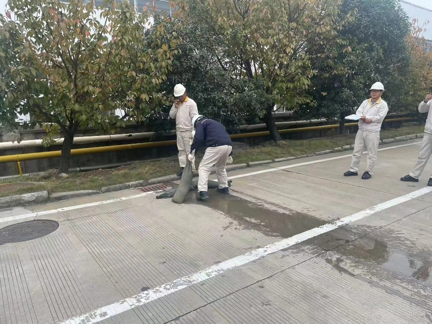 演練過程中,各科室成員表現(xiàn)出了高度的協(xié)作精神和專業(yè)素養(yǎng),他們按照預定的應急流程,有序地進行著各項操作。從泄漏源頭的控制,污染地面的清理,到雨水管道的封鎖和清洗,每一個環(huán)節(jié)按照規(guī)定動作,認真完成各自的任務。