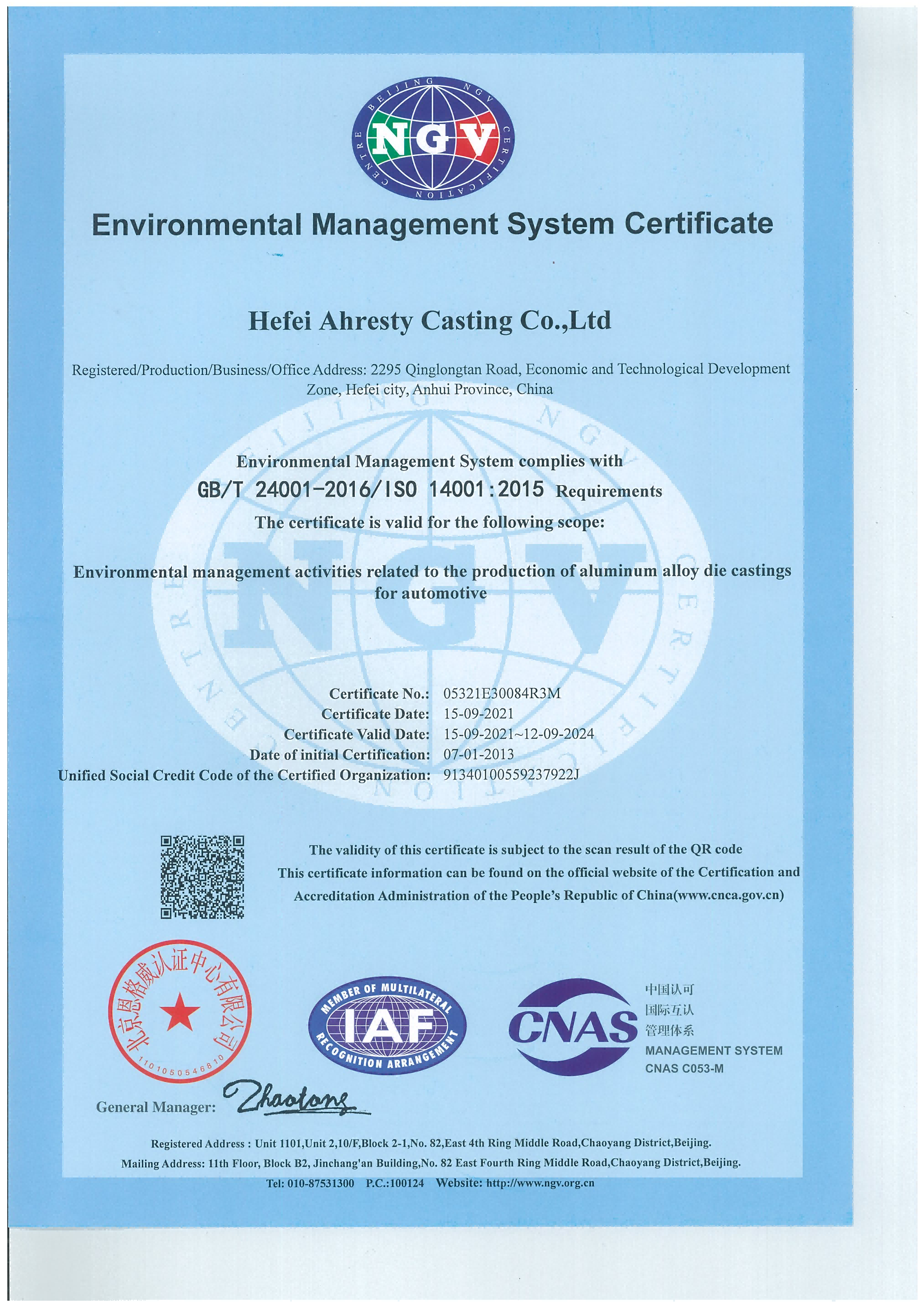 環(huán)境管理體系認(rèn)證證書英文版